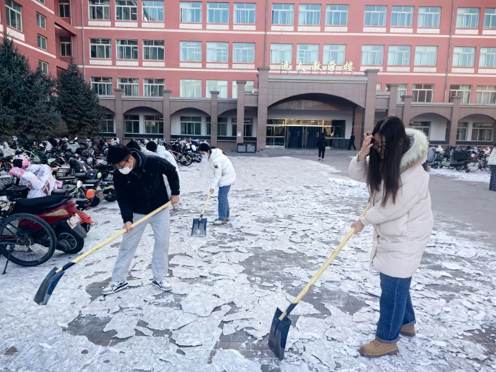 活动当天,全体员工党员手持铁锹、扫帚等工具,准时在九号教学楼前集合。在党支部书记的带领下,大家迅速分组,明确分工,投入到紧张的清扫工作中。在清扫过程中,党员们充分发扬不怕苦、不怕累的精神,有的挥动铁锹铲除厚厚的积雪,有的紧握扫帚清扫路面上的积冰。尽管天气寒冷,但大家的心中却充满了温暖和热情。经过一个多小时的努力,九号教学楼周边的积雪和积冰被彻底清除,道路恢复了往日的整洁与畅通。