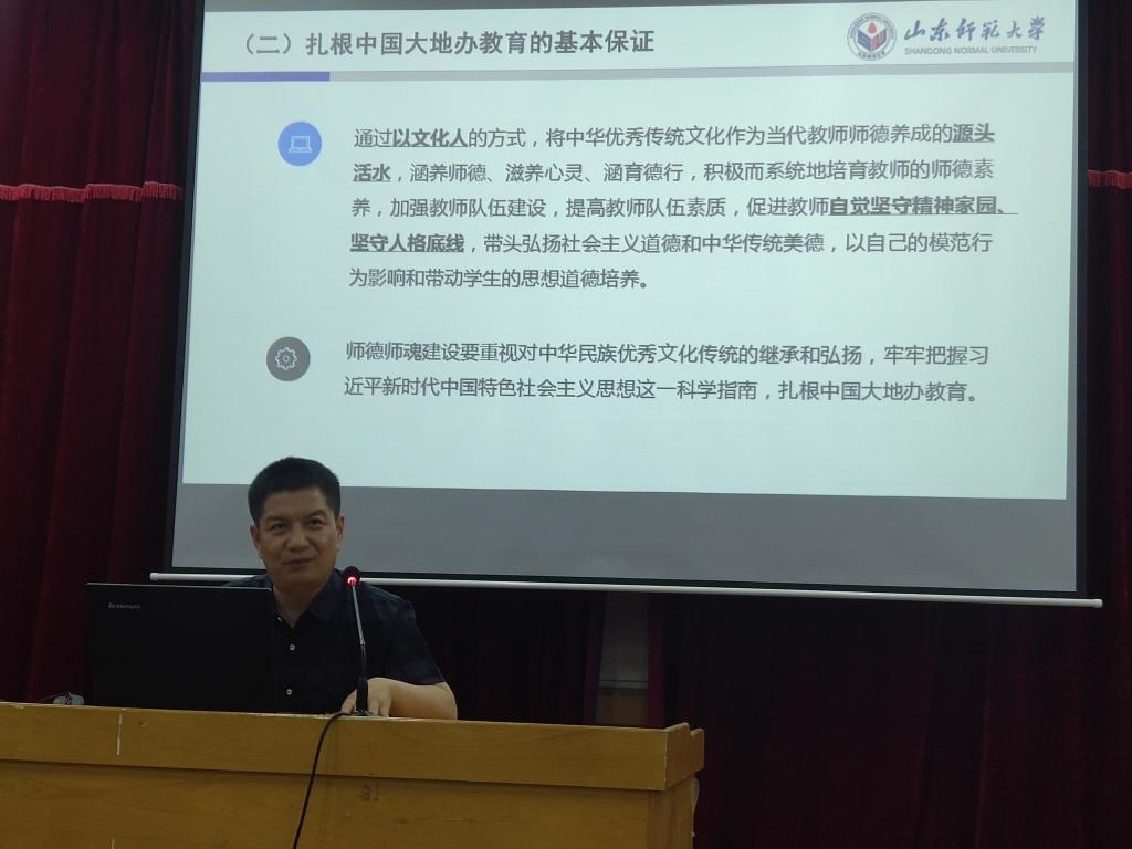 6月15日下午,孙宽宁教授为公司师生作了“教师的自我发现与专业成长”的学术报告。报告中,孙教授阐述了教师工作的三重属性、教师工作的自我回归、教师专业成长的机制和路径,孙教授结合大量的教学案例让师生感受和理解了“教育事业即求道人生”的真谛。冯永刚教授作了“以中华优秀传统文化滋养师德师魂”的学术报告。冯教授围绕习近平总书记在全国教育大会上的讲话精神阐述了以中华优秀传统文化滋养师德师魂的重要意和基本内涵,并从优秀传统文化坚定教师理想信念、厚植教师仁爱之心、提升教师师表形象、锤炼教师道德意志、激发教师道德智慧以及打造教师道德发展共同体等方面提出了优秀传统文化铸就师德师魂的路径。