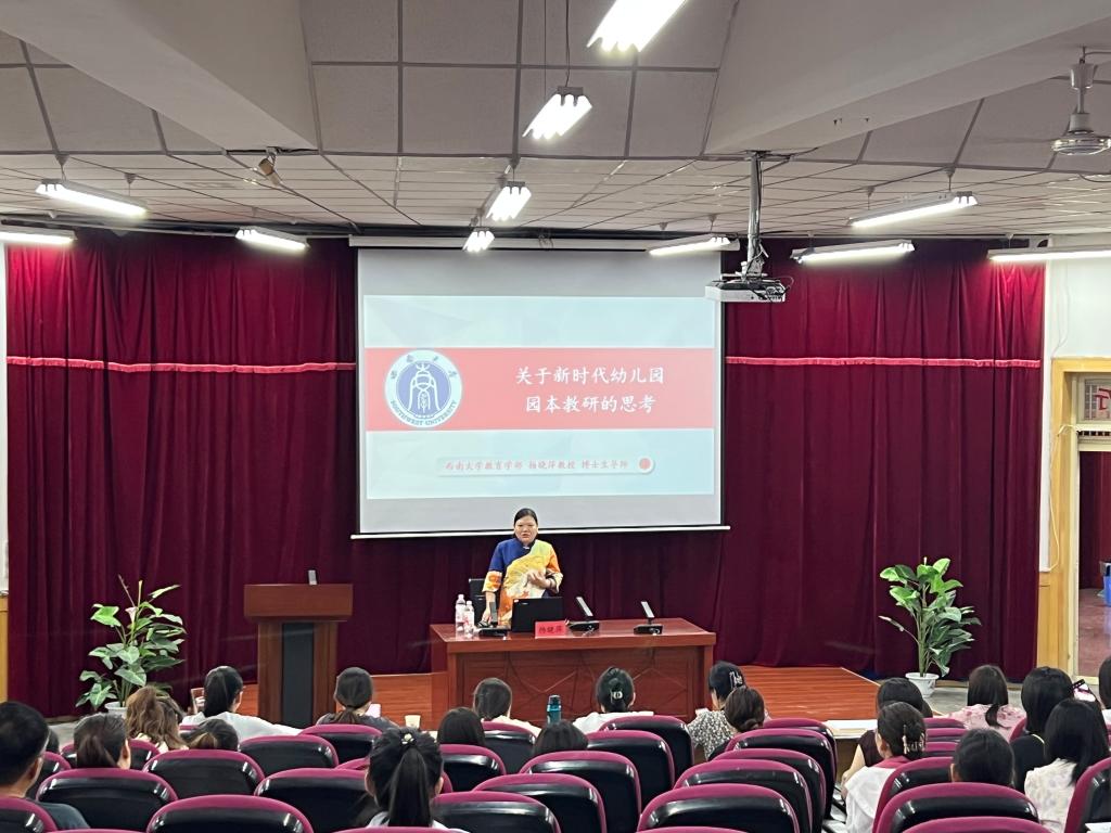 6月30日,西南大学教育学部杨晓萍教授、杨雄博士、西北师范大学郑名教授,分别为“国培计划(2024)”农村幼儿园骨干园长培训项目班学员作了“新时代幼儿园园本教研的思考”“幼儿园园本课程建构理路与实操”和“《幼儿园保育与教育质量评估指南》解读”的学术报告。“国培计划(2024)”农村幼儿园骨干园长培训项目培训班200名学员、张掖市教育局选派的100名园长、甘州区部分幼儿园教师和太阳成集团tyc122cc学前教育专业师生共300余人参加了报告会。