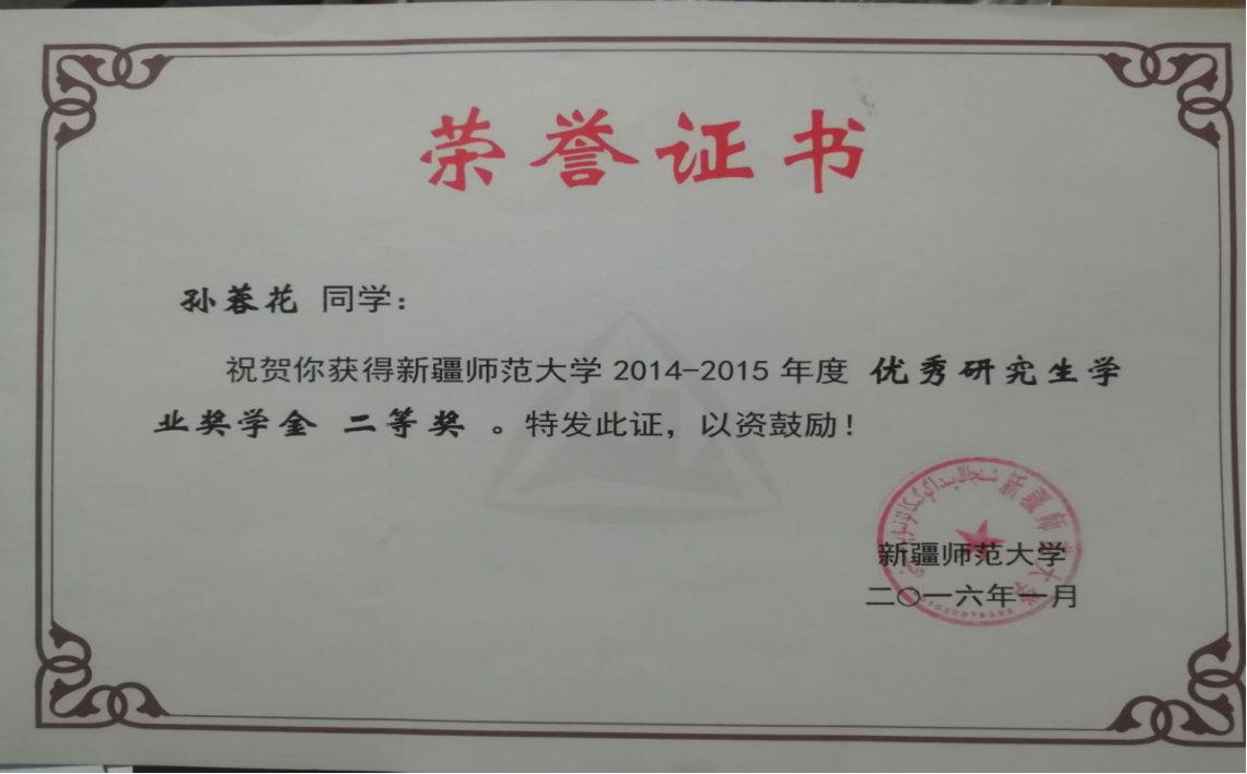 刚进入研究生阶段,由于我是跨考的,很多课程在本科期间没有学过,老师讲课跟不上节奏,一些制图软件和系统不会使用,小论文不会写、英语口语不过关,当时有退学的想法,想回家考老师,但不敢告诉父母,一段时间内心十分焦灼,在我最低谷的时候,我的导师和同学们不断鼓励我,帮助我,让我顺利完成第一学期的任务。寒假期间,为了第二学期能轻松一点,导师特意把我下,让我参与国家自然基金课题项目,开始接触实验,在导师的细心指导和自己挑灯夜战下,顺利完成第一批实验,得到老师的肯定,慢慢地自己也变得自信了,后来又跟随导师完成了3个课题项目,并以第一作者发表北图核心期刊论文2篇,硕士毕业论文被中国知网收录。在校期间通过自己的努力,荣获新疆师范大学“优秀研究生学业奖学金”、新疆师范大学“科研奖学金”,全国老员工英语竞赛自治区级A类三等奖等荣誉。